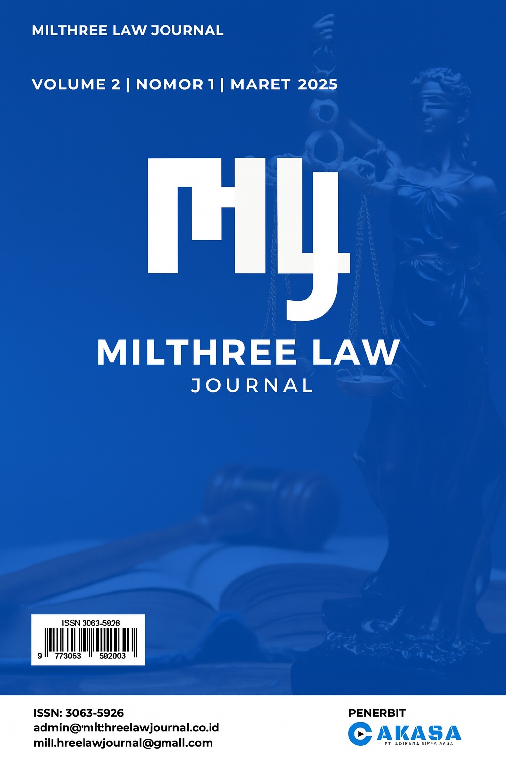 Vol. 1 No. 1 (2024)Edisi perdana Milthree Law Journal, Volume 1 Nomor 1 Maret 2024, merupakan tonggak awal yang penting dalam eksplorasi berbagai isu yang relevan dengan penegakan hukum di Indonesia. Jurnal ini tidak hanya memaparkan permasalahan yang ada, tetapi juga menggali berbagai solusi dan pendekatan untuk meningkatkan efektivitas dan keadilan sistem hukum di negara ini.